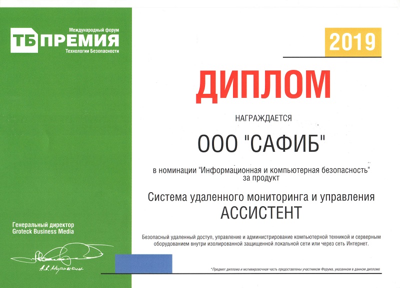 Компания «САФИБ» была отмечена именным дипломом Премии Форума «ПРОДУКТ ГОДА» в номинации «Компьютерная и информационная безопасность» за разработку АССИСТЕНТ. Получение данной награды свидетельствует о важности Системы АССИСТЕНТ среди программных решений безопасного удаленного доступа и защиты данных.