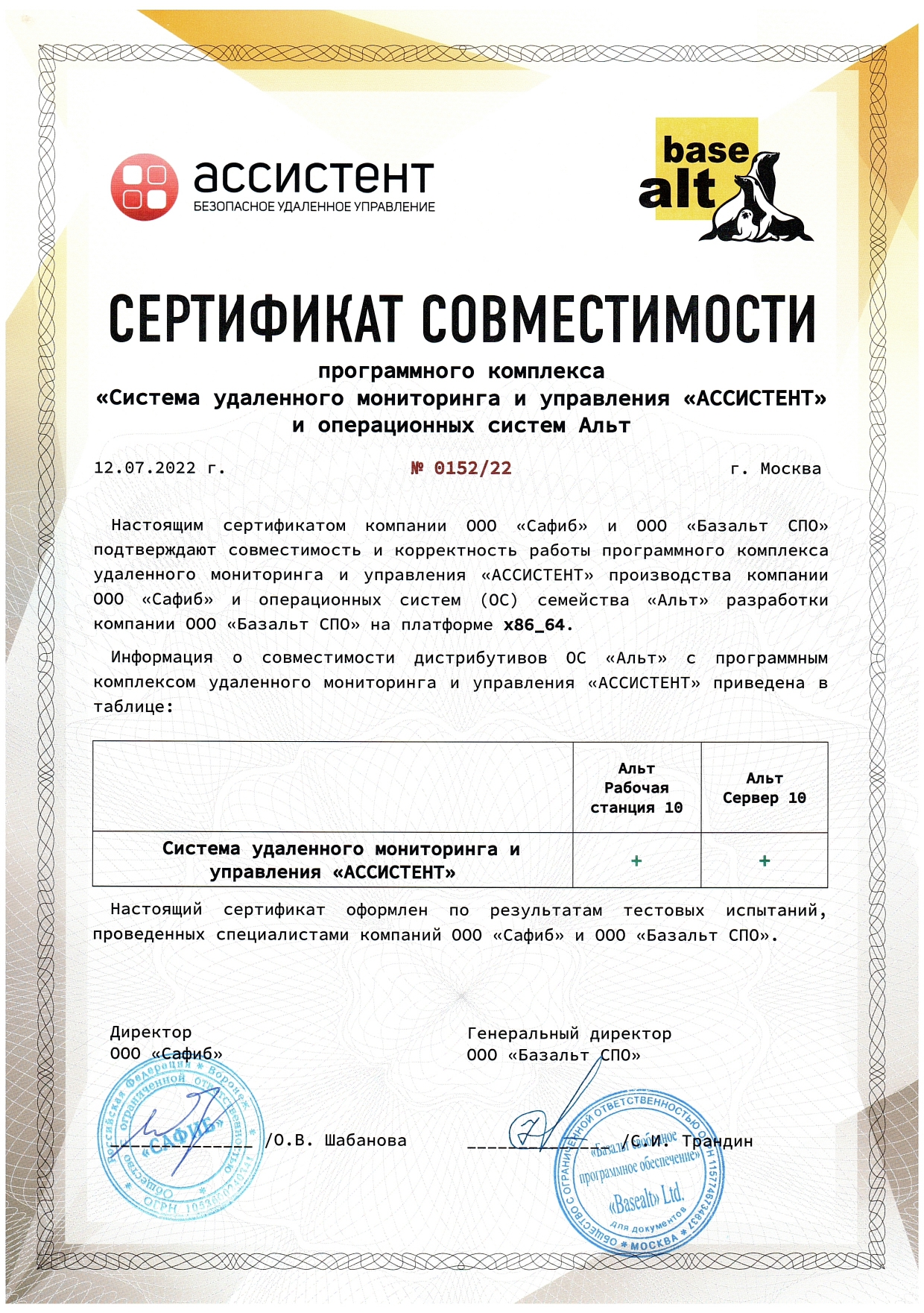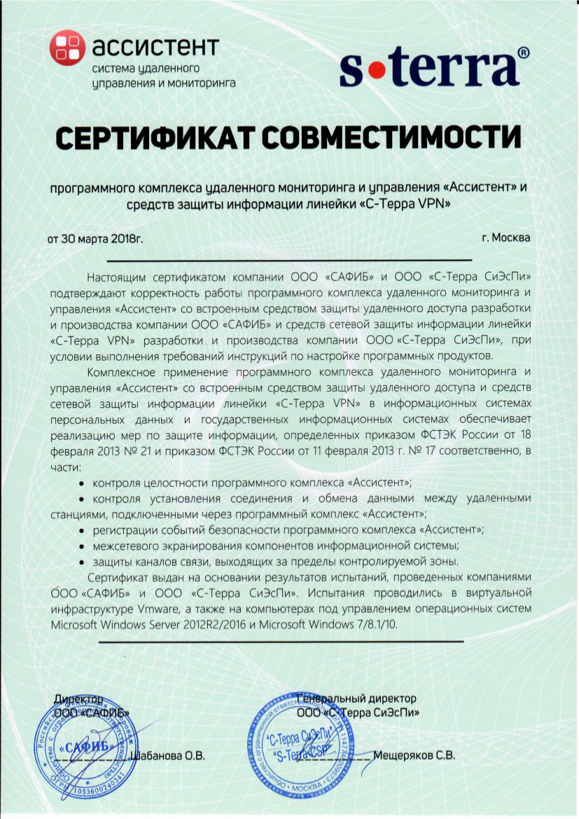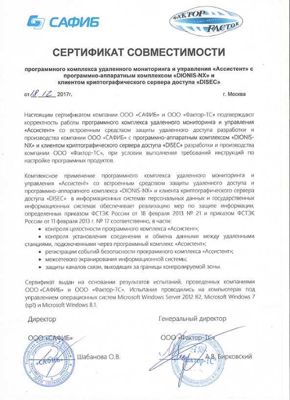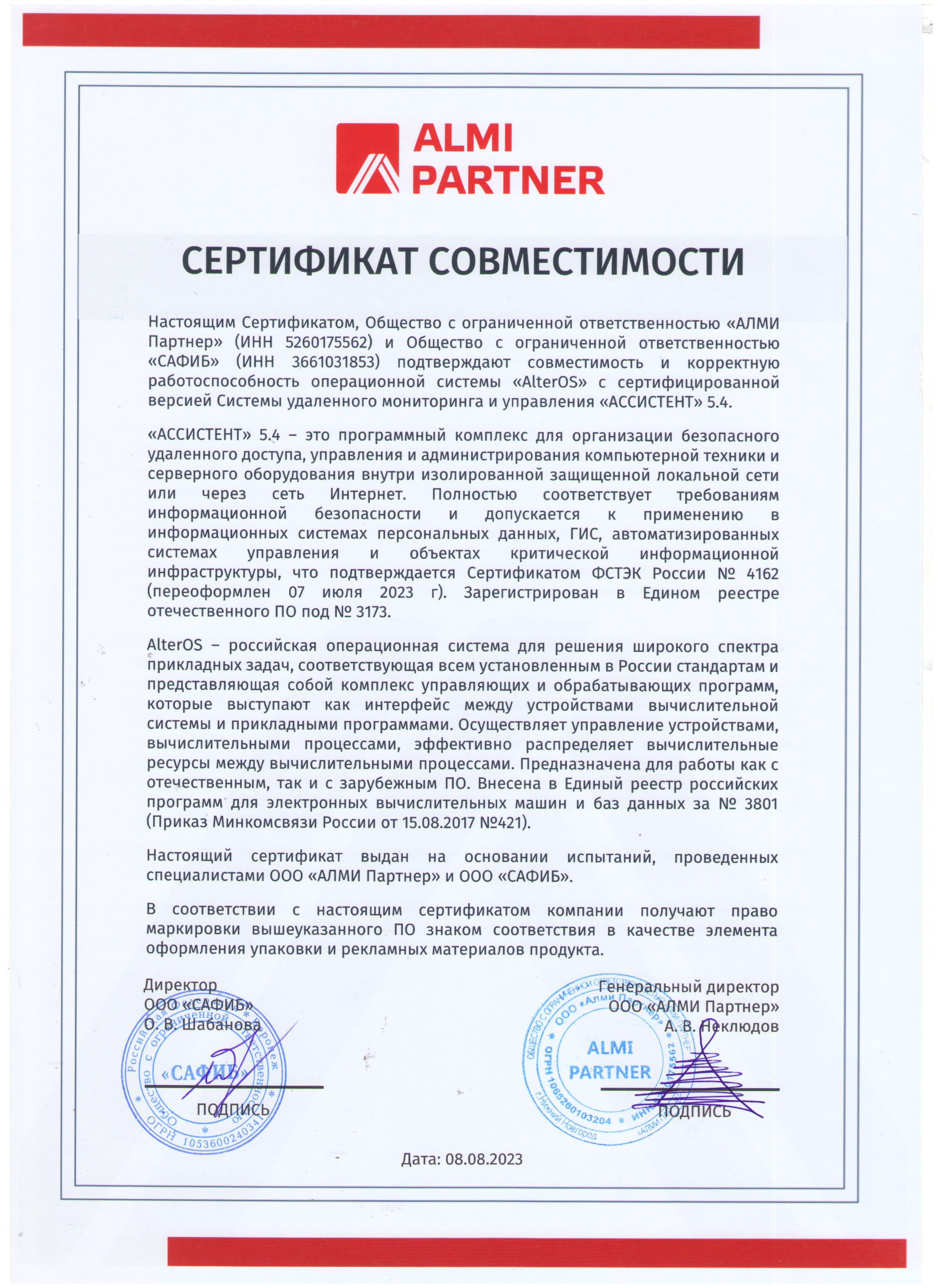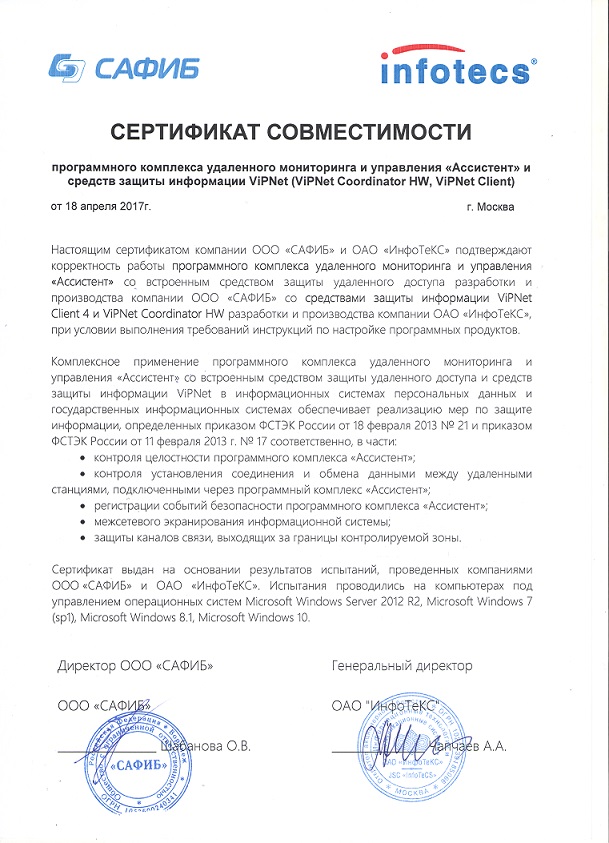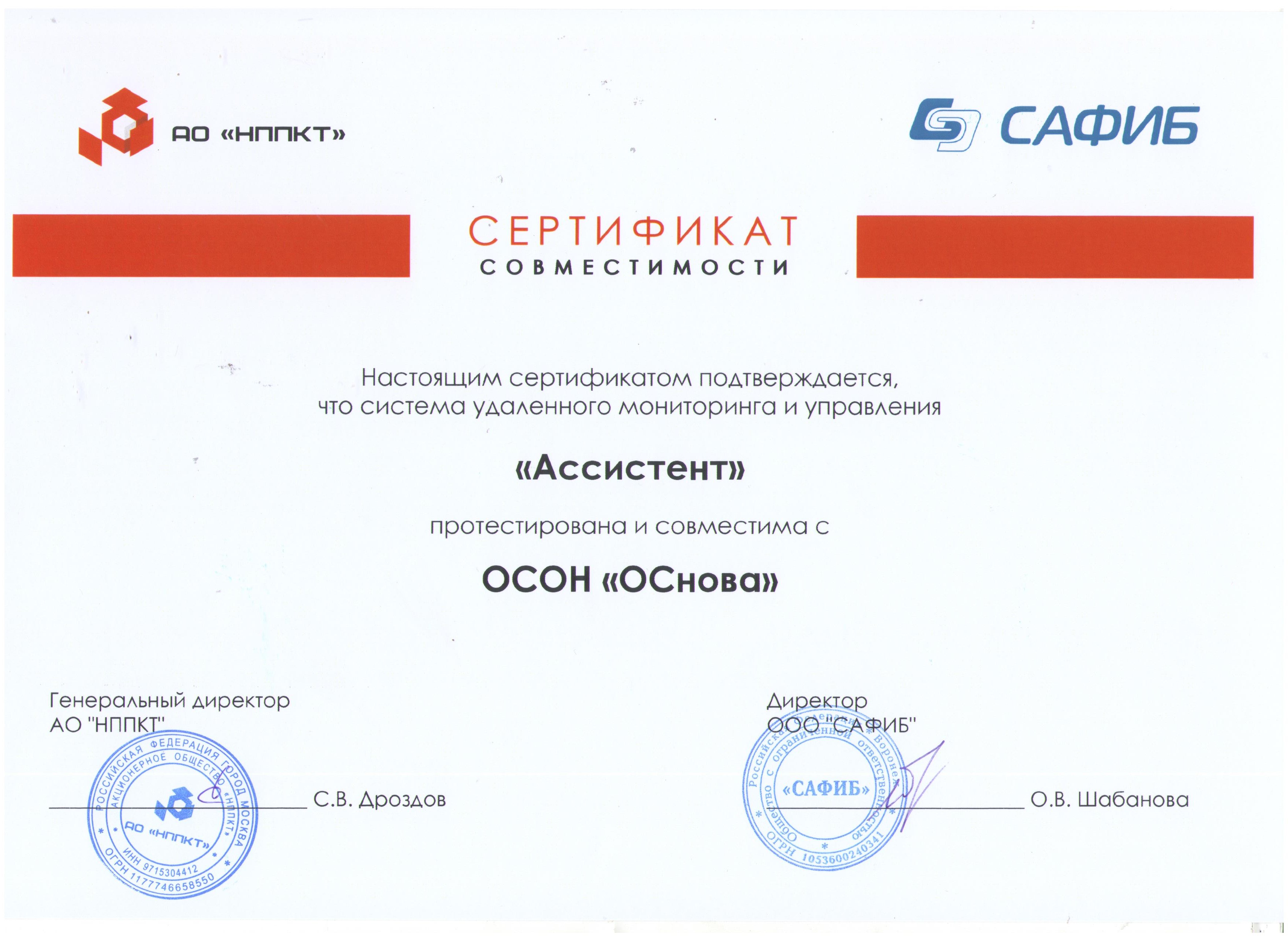 Компания САФИБ уделяет особое внимание подтверждению совместимости с программными продуктами и аппаратным обеспечением сторонних производителей. Это позволяет гарантировать работоспособность программного комплекса АССИСТЕНТ совместно с продуктами наших партнеров, что подтверждается проведением испытаний.